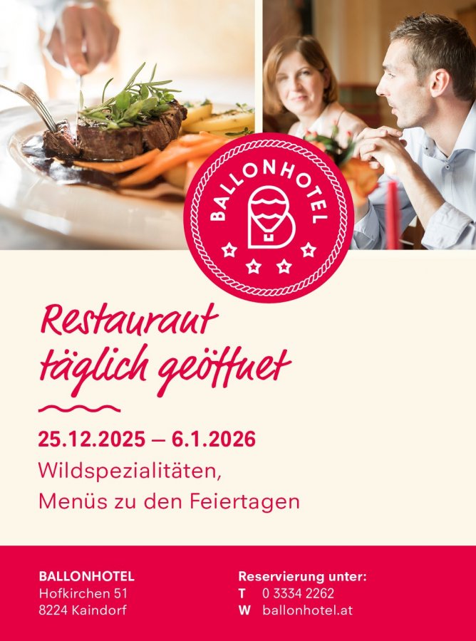 Genuss auf höchster Ebene – für unser Restaurant im Ballonhotel Thaller in Kaindorf bedeutet das: regionale und zeitgemäße Gerichte, bodenständige steirische Schmankerln und internationale Küche. Wir servieren Ihnen alle Gerichte mit frischen und regionalen Zutaten und verwöhnen Sie mit einer breiten Palette an selbstgemachten Köstlichkeiten, etwa Marmeladen, Apfelsaft oder Kräutern aus dem eigenen Garten. Im Sommer warten laue Abende mit köstlichen Grill-Spezialitäten sowie Themenbuffets wie etwa bei einem griechischen Abend. Selbstverständlich haben wir auch ein reichhaltiges á-la-carte-Angebot zusammengestellt, das keine Wünsche offen lässt.
